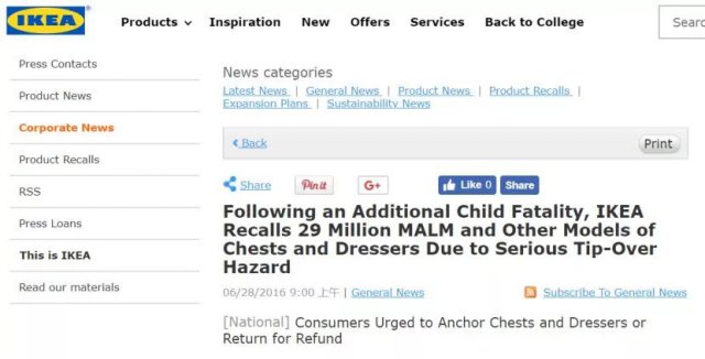 2016年6月28日,宜家開(kāi)始在美國(guó)和加拿大市場(chǎng)召回馬爾姆(Malm)抽屜柜。
