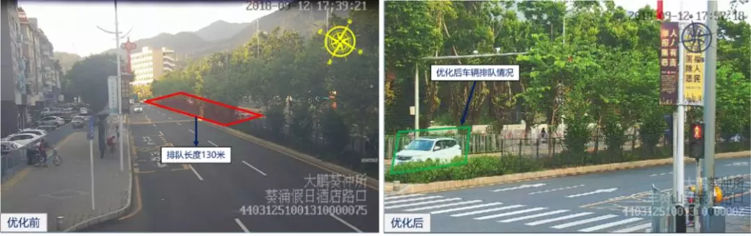 坪葵/豐樹(shù)山路口晚高峰時(shí)段南進(jìn)口左轉(zhuǎn)、掉頭車(chē)輛通行需求大,排隊(duì)長(zhǎng)度可達(dá)130米。9月12日,深圳交警對(duì)路口17:20至18:30期間的配時(shí)方案進(jìn)行優(yōu)化,增加南直左單放綠燈時(shí)間,壓縮南北對(duì)放綠燈時(shí)間,優(yōu)化后,左轉(zhuǎn)車(chē)輛均可一個(gè)周期內(nèi)清空,排隊(duì)長(zhǎng)度縮短96%。