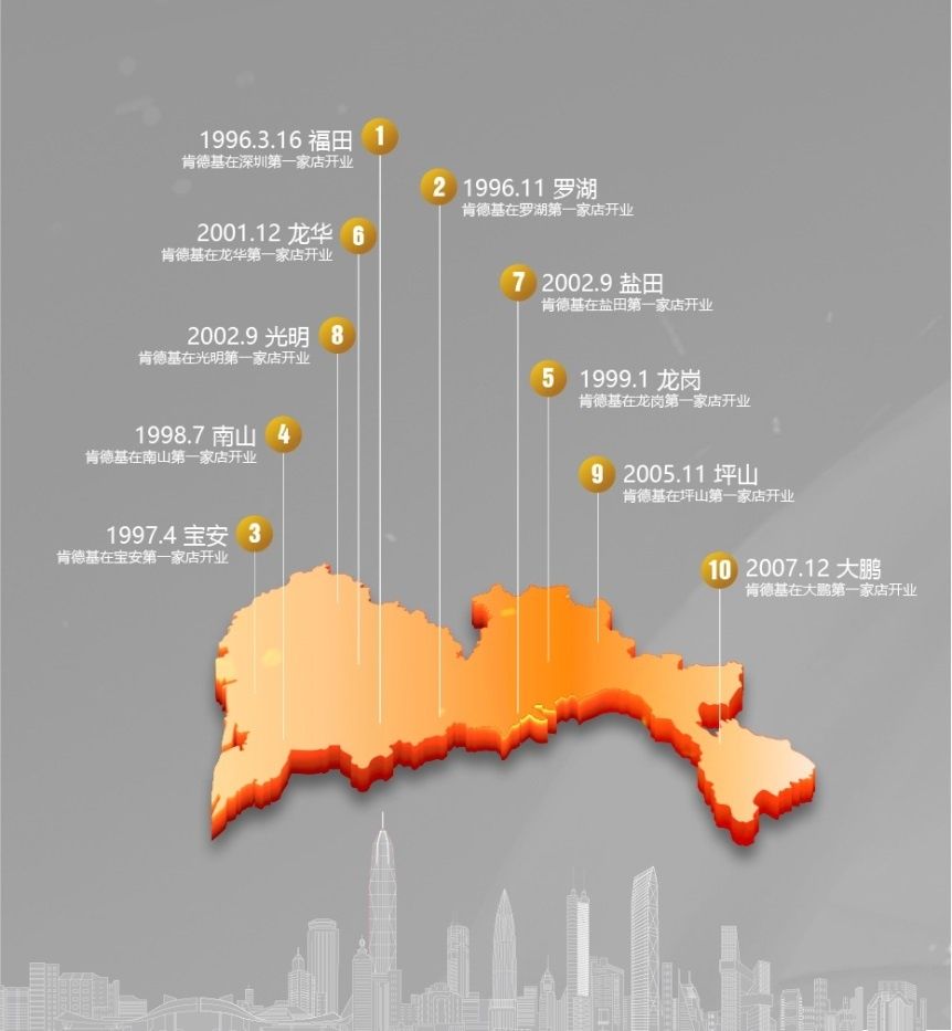 2007年,是深圳的大年份,也是肯德基的大年份。2007年,深圳人均GDP達(dá)到10684美元,首次超過1萬美元??系禄拈_店數(shù)量也在那一年突破了100家,達(dá)到108家。同時,肯德基完成了對現(xiàn)在深圳十區(qū)的開店布局。