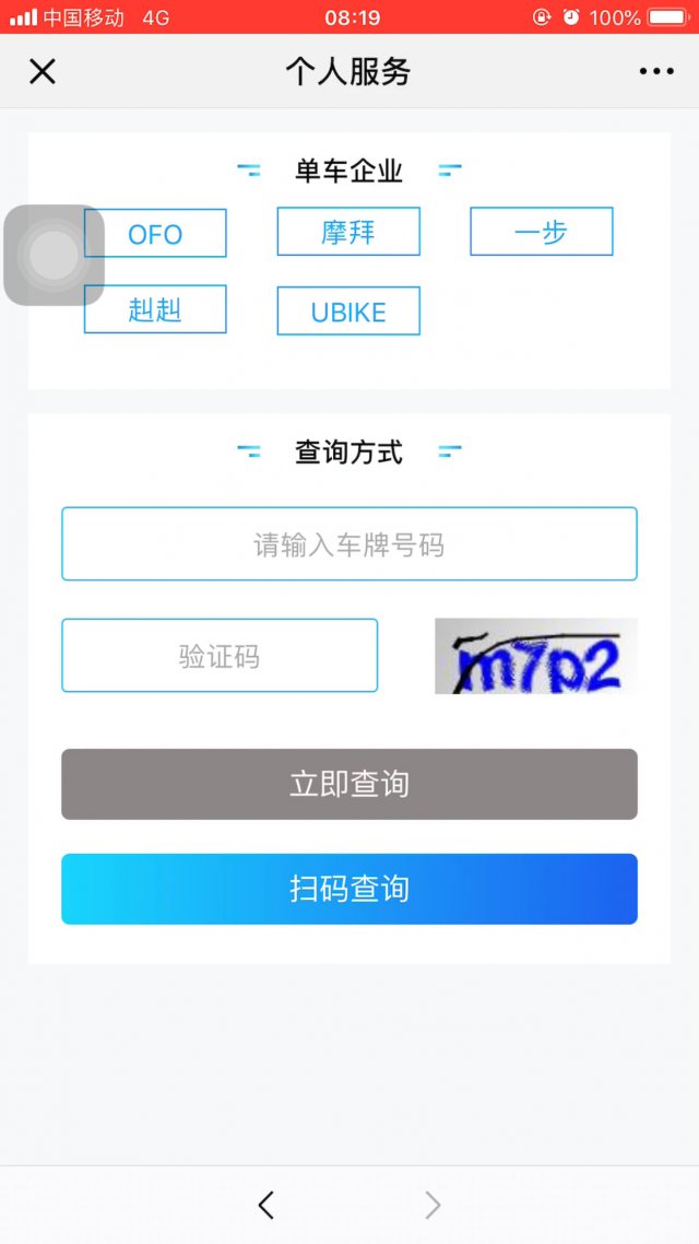 提交完手機(jī)號(hào)和驗(yàn)證碼之后,我們就來(lái)到了這個(gè)頁(yè)面,在這里,你可以選擇你要查詢的共享單車的品牌,品牌選擇完畢后,你可以選擇手動(dòng)輸入車牌號(hào)碼或掃碼查詢!