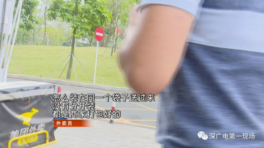 今天中午,記者從外賣平臺上隨機選取了幾家餐廳,分別購買了四份外賣,并配了冷飲。不過第一份外賣送上門,記者就發(fā)現(xiàn)冷飲與熱菜被裝在了同一個袋子中。