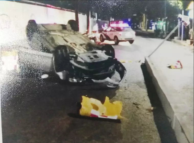 ,小車側(cè)翻撞成了個(gè)“四輪朝天”,現(xiàn)場(chǎng)一片狼藉,幸運(yùn)的是車門開得了,周某便打開車門爬了出來(lái)。