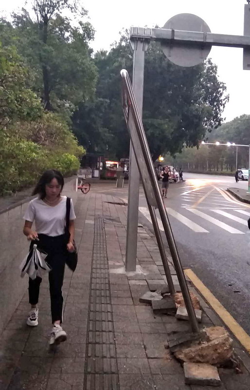 存在安全隱患的不僅電線桿,記者在蓮花山公園附近一人流量較大的十字街頭發(fā)現(xiàn),有一塊交通路牌也被“山竹”吹的東倒西歪,其底部根基已經(jīng)翻出一半,讓人擔(dān)心其會隨時倒下、危及過往路人安全。“我每天上下班都會經(jīng)過這里,騎著車又不得不走路牌內(nèi)側(cè),每次都有點小怕,擔(dān)心牌子會突然倒下砸到我?!备浇木用裣蛴浾咄虏鄣馈?/p>