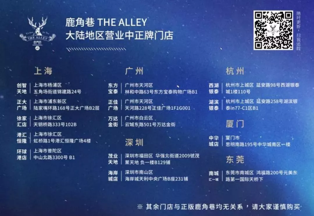 據(jù)大陸地區(qū)品牌總經(jīng)理譚力說:如果你在街邊小攤看到鹿角巷,那肯定是假的。因為我們只入駐大型商場。