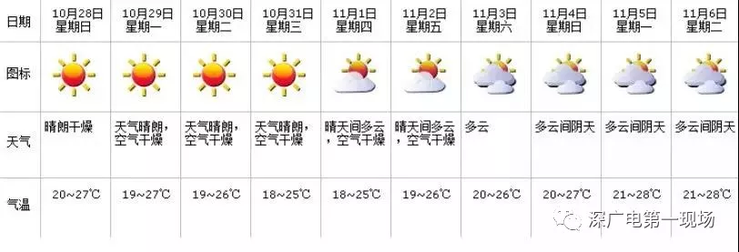 28日到11月1日持續(xù)晴朗干燥,28日氣溫20-27℃;11月2日起云量逐漸增多。火險(xiǎn)預(yù)警信號(hào)將持續(xù)生效,建議做好防火安全管理。