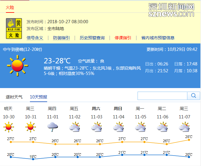 記者從深圳市氣象局了解到,29日,深圳市晴朗干燥;氣溫在20-28℃;東北風(fēng)3級(jí),陣風(fēng)5-6級(jí);相對(duì)濕度30%-70%?;痣U(xiǎn)預(yù)警信號(hào)生效中。