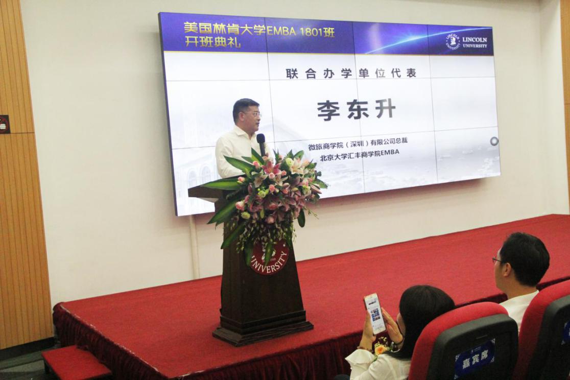 美國(guó)林肯大學(xué)的發(fā)展也離不開(kāi)合作辦學(xué)單位的支持,聯(lián)合辦學(xué)合作單位代表李東升先生,分享了他就讀EMBA的心得,同時(shí)也對(duì)新教育的理念、新時(shí)代企業(yè)發(fā)展的模式提出了自己的見(jiàn)解。