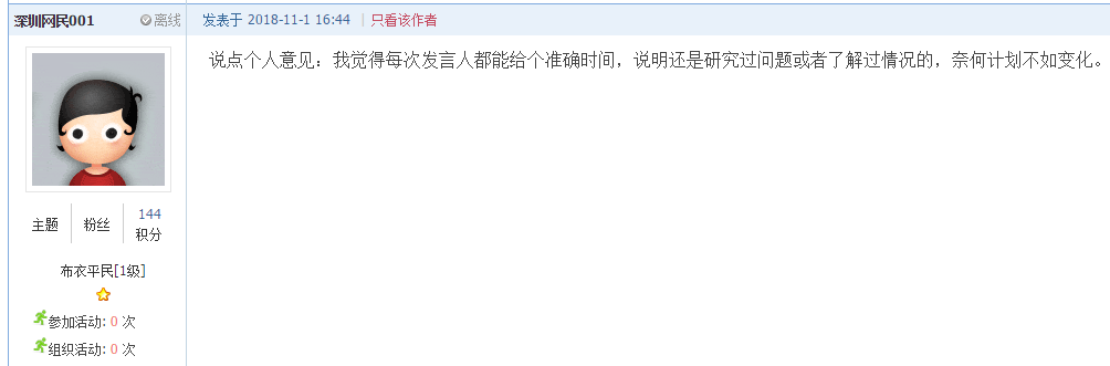 據(jù)了解,為改善居民出行條件,美化居住環(huán)境,羅湖區(qū)于2016年發(fā)布了十大微片區(qū)交通和景觀綜合提升工程計(jì)劃。該計(jì)劃表示全工程將分三年實(shí)施,而太白路-東湖路微片區(qū)屬第二期,應(yīng)于2017年開(kāi)始動(dòng)工實(shí)施。但截至2018年11月,該項(xiàng)目仍未動(dòng)工。從網(wǎng)友發(fā)布的截圖上看,一個(gè)名為“羅湖區(qū)城管局發(fā)言人”的論壇賬號(hào)分別于2017年2月、12月以及2018年7月和8月對(duì)太白路-東湖路微片區(qū)景觀提升工程延遲實(shí)施的計(jì)劃進(jìn)行了回復(fù)。而相應(yīng)的動(dòng)工日期也從2018年上半年延遲到了2018年底。