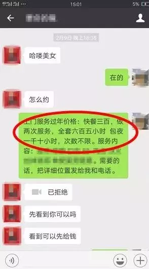 受害人看到招嫖信息主動聯(lián)系時,騙子立即承諾服務內容,讓受害人悠然神往,喪失理智。