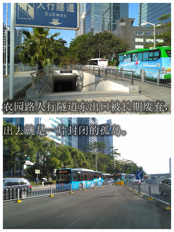 自2017年連通深南大道兩側(cè),可供行人通行的人行天橋被拆卸后,行人都只能從人行隧道過(guò)街。但奇怪的是,人行隧道的東出口處是一片被隔離、被荒廢的“孤島”,這讓需要從此出口通行的市民很尷尬。即使避開(kāi)這個(gè)出口,選擇繞行,又容易在農(nóng)園路口與右轉(zhuǎn)車輛發(fā)生沖突?!罢娴暮転殡y我們啊?!笔忻駞窍壬C實(shí)了步行通過(guò)該路段的“艱難”。