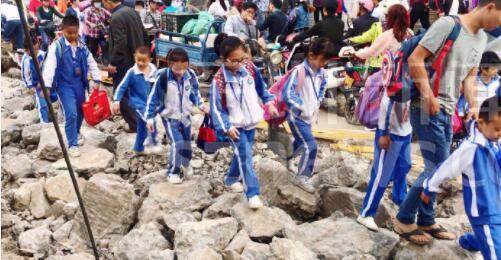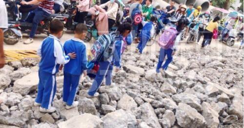 成群的學生在碎石上走過,旁邊小道擠滿三輪、電動單車(網(wǎng)友“伊戈達拉”供圖