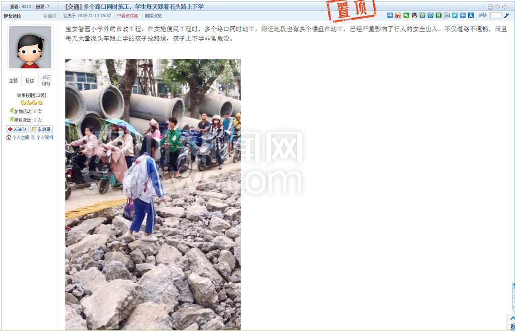 深圳新聞網(wǎng)11月14日訊(記者劉婷)“多個路口同時施工,學生每天踩著石頭路上下學,這也太危險了呀!”13日,網(wǎng)友“伊戈達拉”在深圳論壇上發(fā)帖稱,寶安智園小學外多個路口同時動工,加上附近地段多個樓盤在動工,導致學生上學路被挖得面目全非,嚴重影響出行安全。(網(wǎng)帖:https://szbbs.sznews.com/thread-3819007-1-1.html