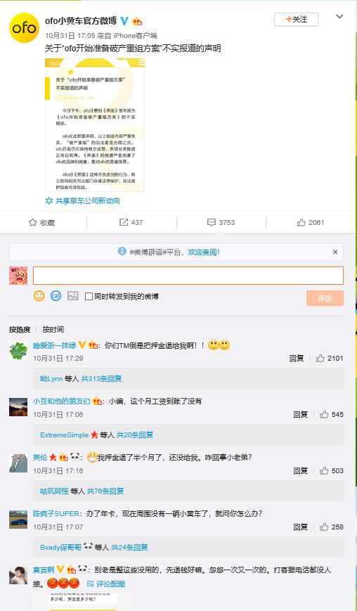 今年10月底,《界面》新聞發(fā)布題為《ofo開(kāi)始準(zhǔn)備破產(chǎn)重組方案》的報(bào)道。當(dāng)日,ofo官微稱該報(bào)道嚴(yán)重失實(shí),將訴諸法律維護(hù)自身合法權(quán)益。