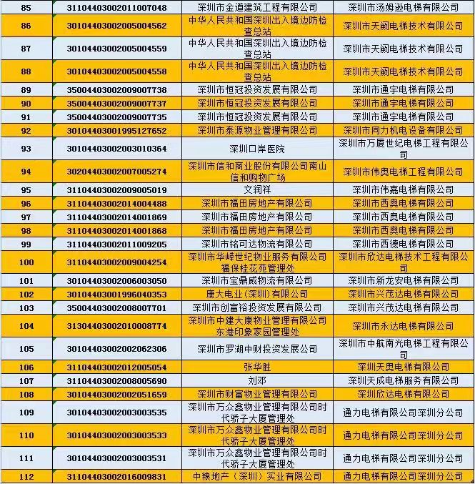 不合格電梯維保單位為:1、深圳市誠(chéng)禾機(jī)電設(shè)備有限公司;2、深圳市通宇電梯有限公司;3、深圳市安眾電梯工程有限公司;4、深圳市蓉奧電梯有限公司;5、清遠(yuǎn)市中日富士電梯有限公司;6、富士通(深圳)有限公司。