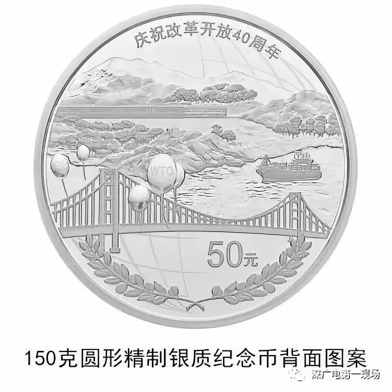 背面圖案為象征“一帶一路”的陸地、海洋、橋梁、橄欖枝等裝飾組合設(shè)計,并刊“慶祝改革開放40周年”字樣及面額。