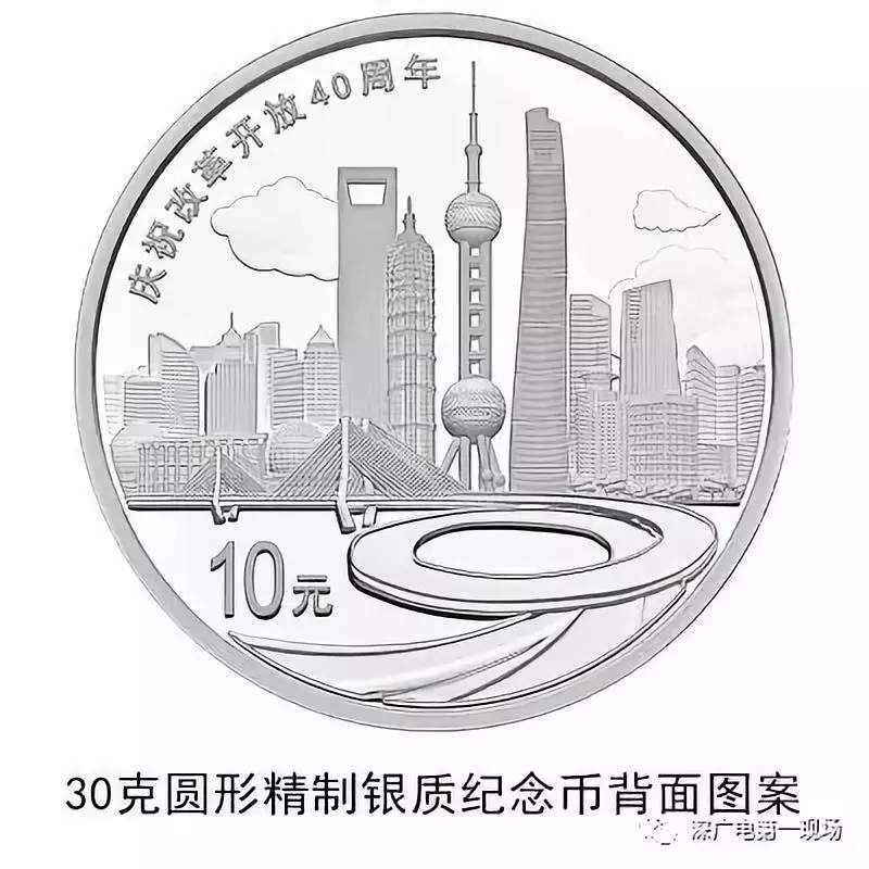 30克圓形銀質(zhì)紀(jì)念幣背面圖案之三為上海浦東標(biāo)志性建筑及南浦大橋、黃浦江等組合設(shè)計,并刊“慶祝改革開放40周年”字樣及面額。
