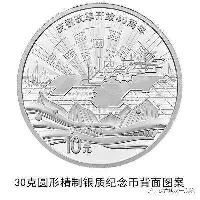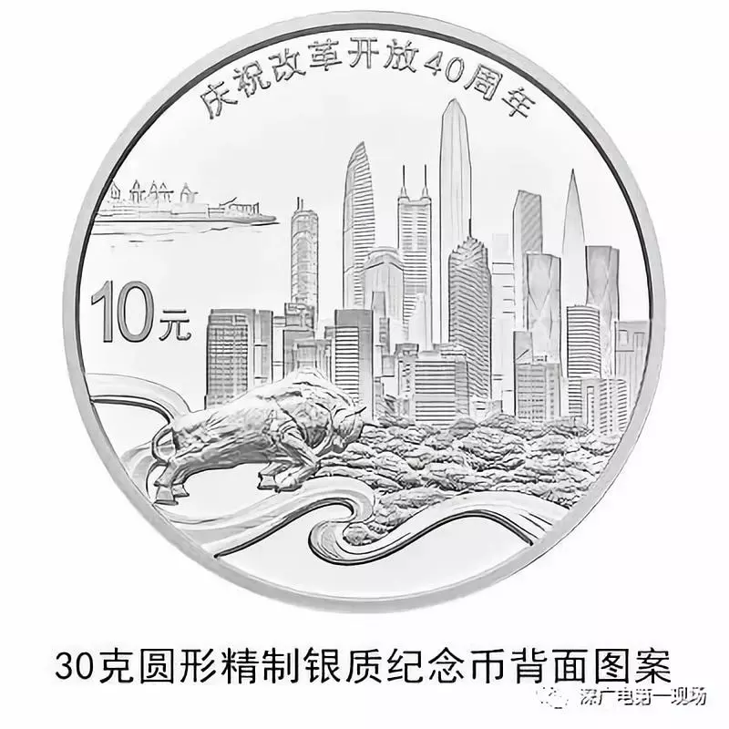 30克圓形銀質(zhì)紀(jì)念幣背面圖案之二為深圳城市建筑、蛇口港、拓荒牛雕塑及飄帶等組合設(shè)計,并刊“慶祝改革開放40周年”字樣及面額。