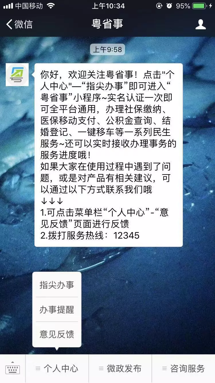 1、關(guān)注“粵省事”公眾號,點擊菜單欄“個人中心”-“指尖辦事”