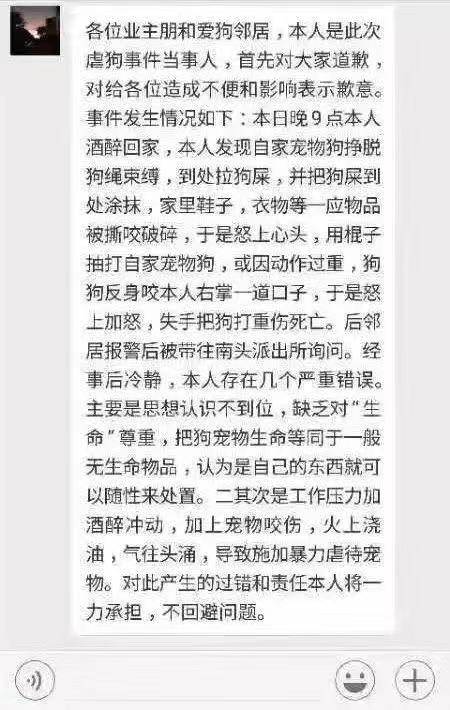 當(dāng)天深夜,男子在業(yè)主群中道歉,稱自己晚上9點(diǎn)醉酒回家,發(fā)現(xiàn)自家寵物狗掙脫狗鏈,到處拉屎還將家里的鞋子、衣物撕咬破碎,抽打自家寵物狗時,又被反咬一口,才會失手將狗打成重傷,同時男子表示“對此產(chǎn)生的過錯和責(zé)任本人將一力承擔(dān),不回避問題?!?/p>