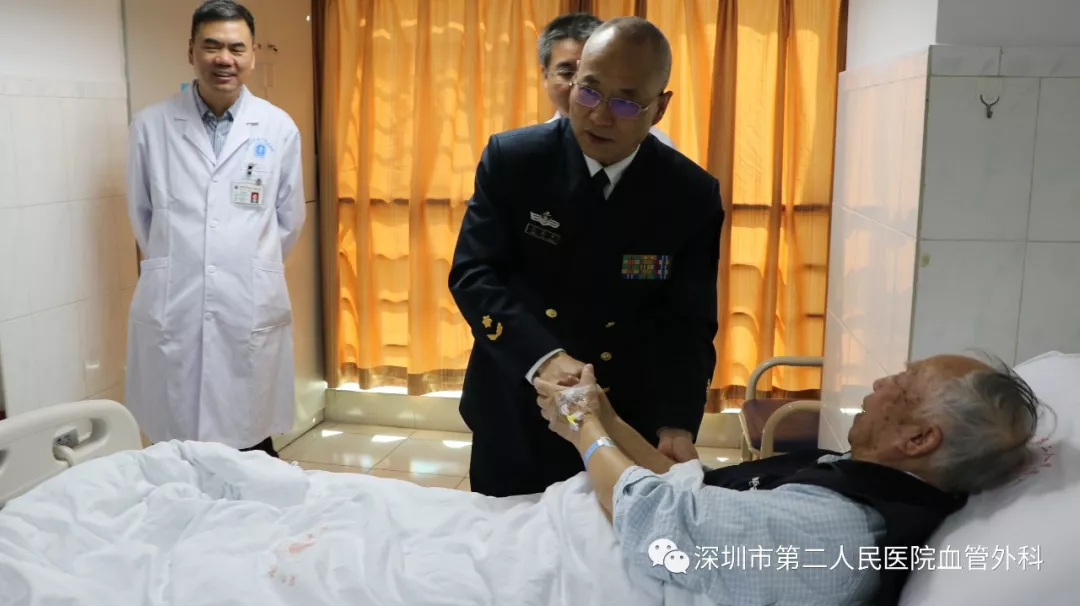 座談會(huì)結(jié)束后,景在平教授、趙永勝副院長(zhǎng)與科室醫(yī)護(hù)人員一起,進(jìn)行了床邊臨床教學(xué)查房,同時(shí)為一位腹主動(dòng)脈瘤疾病患者會(huì)診?;颊呤强姑涝嫌⑿郏ㄏ硎苘娂?jí)待遇),因發(fā)現(xiàn)腹主動(dòng)脈瘤(俗稱“不定時(shí)炸彈”)后,一直深受該疾病困擾,一度不愿意接受治療。經(jīng)過(guò)景在平教授詳細(xì)講解后豁然開(kāi)朗,同意接受治療,并要求在景在平教授團(tuán)隊(duì)及朱國(guó)獻(xiàn)主任團(tuán)隊(duì)下進(jìn)行手術(shù)治療。會(huì)診結(jié)束時(shí),老先生緊緊握住景在平教授的手,萬(wàn)分感激。