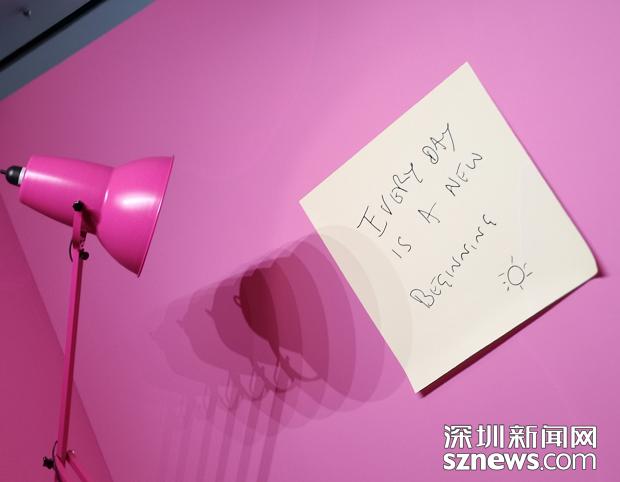 Anglepoise是英國經(jīng)典的臺(tái)燈設(shè)計(jì),Paul Smith先生以他的英式幽默,將它依比例放大成巨型臺(tái)燈,并涂上了展覽主色系的粉紅色,背景再加上 Paul Smith先生最喜愛的便利貼 EVERY DAY IS A NEW BEGINNING,在展覽出口作為對(duì)每位觀眾最后的謝禮。