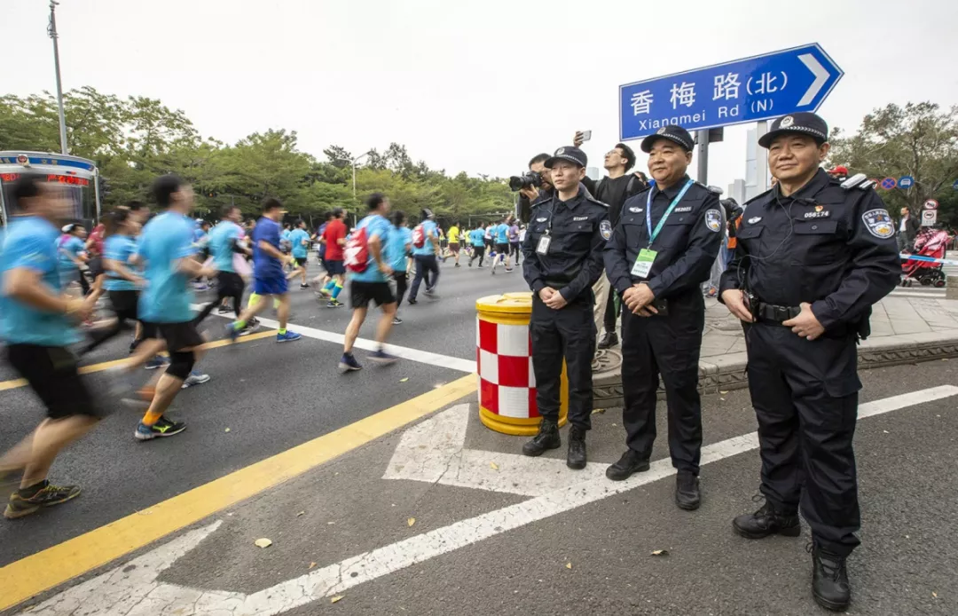 為全力做好此次馬拉松安保工作,福田警方提前謀劃、科學(xué)部署,承擔(dān)全程、半程馬拉松起點(diǎn)及6.2公里賽道的安全保衛(wèi),共出動(dòng)警力1972人,啟用20套4G現(xiàn)場(chǎng)圖傳 “千里眼”,20套視頻識(shí)別探頭“守點(diǎn)”;警力實(shí)時(shí)定位系統(tǒng)、118個(gè)高低空視頻預(yù)案“守線”;71套現(xiàn)場(chǎng)視頻執(zhí)法記錄儀。從凌晨4點(diǎn)到下午2點(diǎn),用長(zhǎng)達(dá)10個(gè)小時(shí)的安?!榜R拉松”為賽事的順利開展保駕護(hù)航。