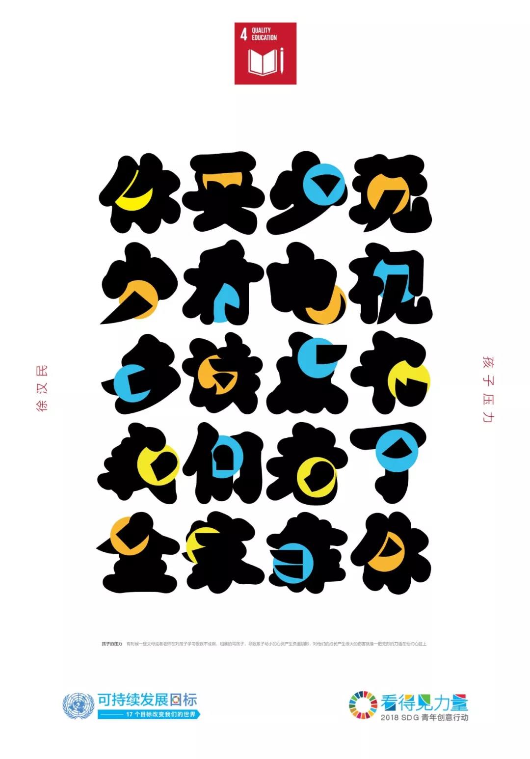 作品解釋 /現(xiàn)在孩子的壓力越來越大,導(dǎo)致很多孩子心理灰暗、暴力犯罪、自我封閉等現(xiàn)象,其中一個原因是父母期望和恨鐵不成鋼打罵給孩子帶來沉重的壓力。由此作者直接用那些語句來設(shè)計,這些字體中穿插著一個小圓點即孩子們的腦袋,他們被這些語言帶來的無形壓力刺痛,整個字比較圓潤只有關(guān)鍵的地方鋒利無比,就像一把無形的刀插在他們心上。