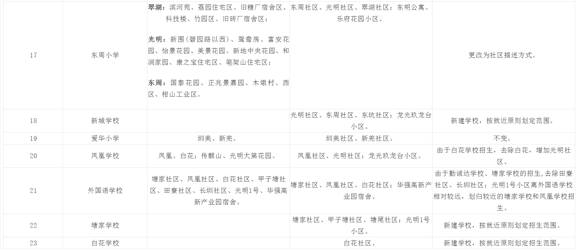 據(jù)悉,2019年光明區(qū)招生原則是原有學(xué)校招生范圍盡量保持不變,新增學(xué)校招生范圍根據(jù)招生規(guī)模、生源情況等按就近原則劃定。由于增加了勤誠達(dá)學(xué)校、信宏城小學(xué)、新城學(xué)校、塘家學(xué)校、白花學(xué)校等5所新建學(xué)校,鳳凰學(xué)校擴(kuò)建項(xiàng)目也已完成,因此,招生片區(qū)擬做調(diào)整為:白花社區(qū)不再安排至光明中學(xué);光明外國語學(xué)校招生去除田寮、長圳、甲子塘片區(qū);光明1號(hào)小區(qū)劃歸較近的塘家學(xué)校和鳳凰學(xué)校招生;馬山頭學(xué)校招生去除合水口片區(qū);光明第二中學(xué)招生去除相對(duì)較遠(yuǎn)的塘尾片區(qū)。公明二小、下村小學(xué)招生去除相對(duì)較遠(yuǎn)的公明社區(qū);長圳學(xué)校招生去除相對(duì)較遠(yuǎn)的塘家社區(qū)、甲子塘社區(qū)。鳳凰學(xué)校招生去除白花,增加光明社區(qū)。