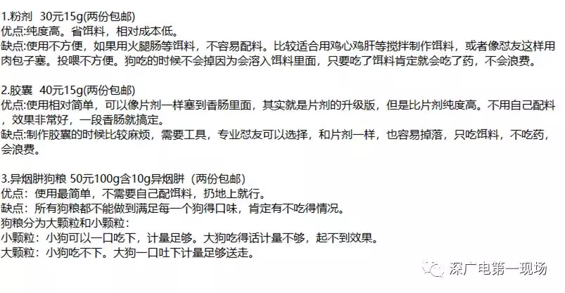 今天上午,記者通過搜索,找到了一名專門售賣異煙肼的網(wǎng)友,對方給出了粉劑、膠囊、異煙肼狗糧三種套餐,每種套餐中還特地標(biāo)明了針對寵物狗的配料優(yōu)缺點,并且直接將寵物狗吃下后的效果也標(biāo)明在其中。