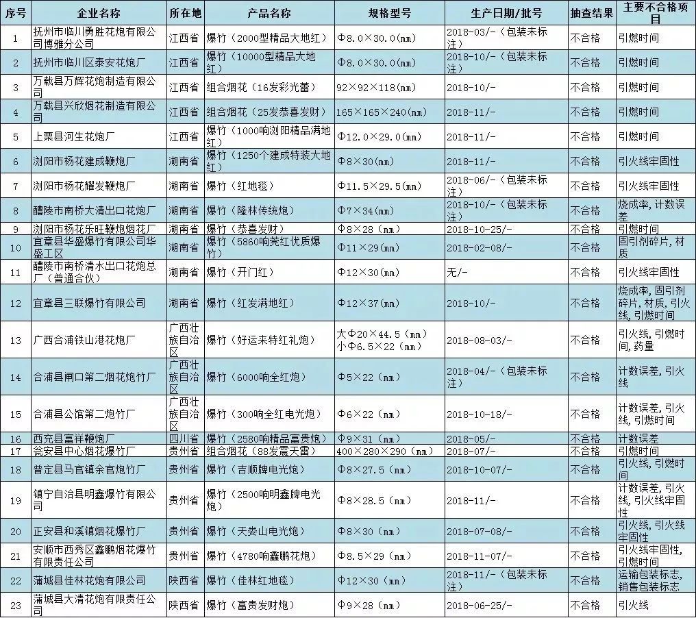 ③國家市場監(jiān)管總局日前組織開展煙花爆竹產(chǎn)品質(zhì)量國家監(jiān)督專項(xiàng)抽查,共抽查6個(gè)省(自治區(qū))150家企業(yè)生產(chǎn)的150批次產(chǎn)品,檢出23批次不合格,不合格發(fā)現(xiàn)率為15.3%。