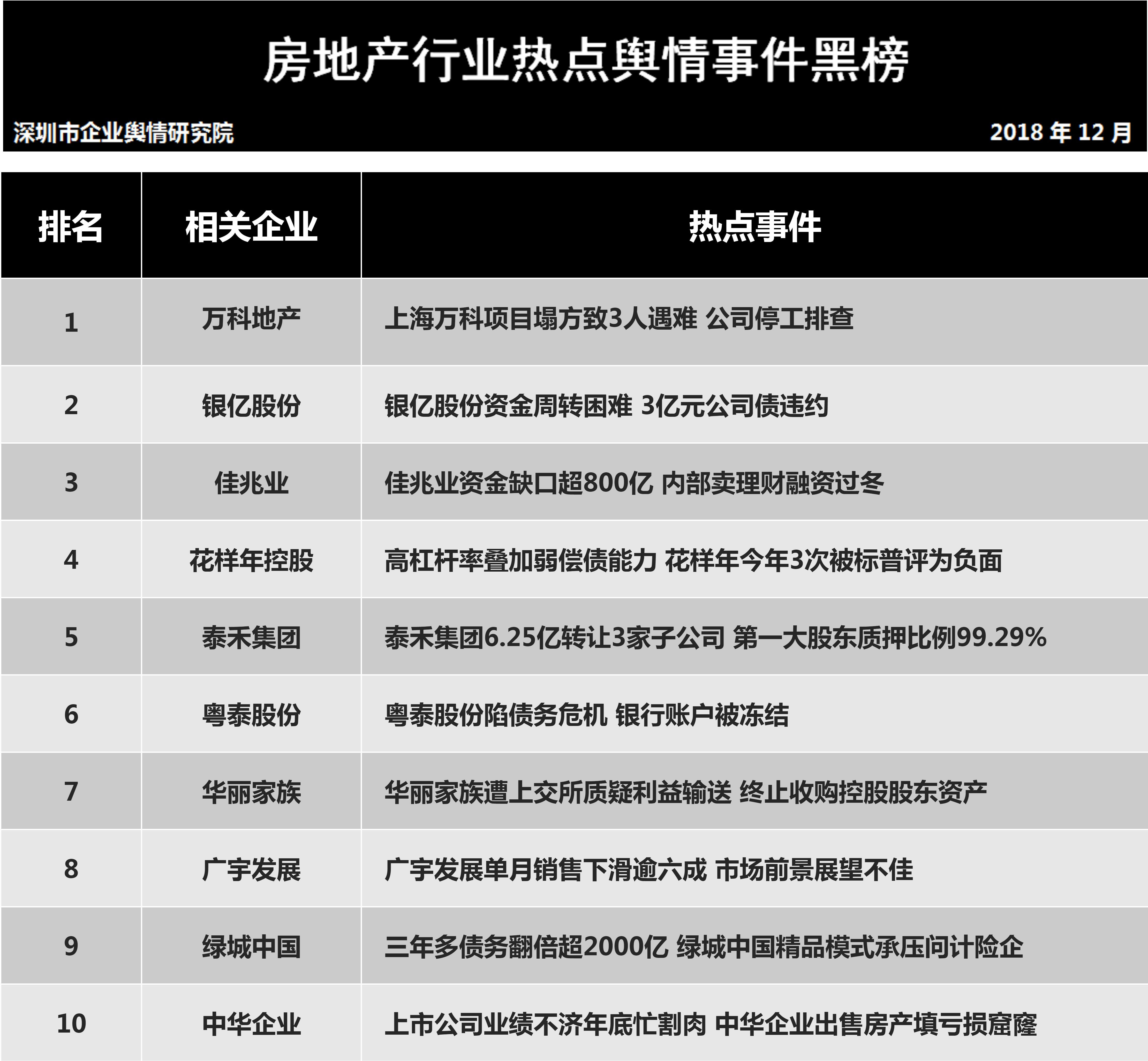 深圳新聞網(wǎng)2019年1月7日訊 (記者田志強 通訊員陳文光)1月7日,深圳企業(yè)輿情研究院發(fā)布第十一批企業(yè)輿情榜單。本次榜單重點聚焦房地產(chǎn)及醫(yī)藥保健兩個行業(yè)。房地產(chǎn)行業(yè)企業(yè)輿情榜單由房地產(chǎn)行業(yè)熱點輿情事件排行榜(紅、黑榜)及房地產(chǎn)企業(yè)公眾形象排行榜組成。