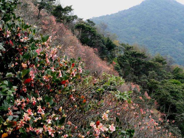 登上梧桐山,遠(yuǎn)看,這片山林如秋日層林盡染,層層綠障中帶著紅邊。吊鐘花自然分布在海撥400m以上山體,主要小梧桐到大梧桐山頂坡面,尤其山脊線兩側(cè)較多。近兩年加強(qiáng)了撫育,現(xiàn)在,小梧桐杜鵑谷(10畝)、葫蘆徑至疊翠亭(30畝)、大梧桐頂(20畝)吊鐘花開花情況較好,都能賞吊鐘。吊鐘較長的花梗下垂懸掛著形如鈴鐺的花朵,其獨特的花形也讓吊鐘有了鈴兒花、倒掛金鐘、燈籠花等別稱。吊鐘是一種落葉或半常綠灌木,樹不高,通常3米左右。
