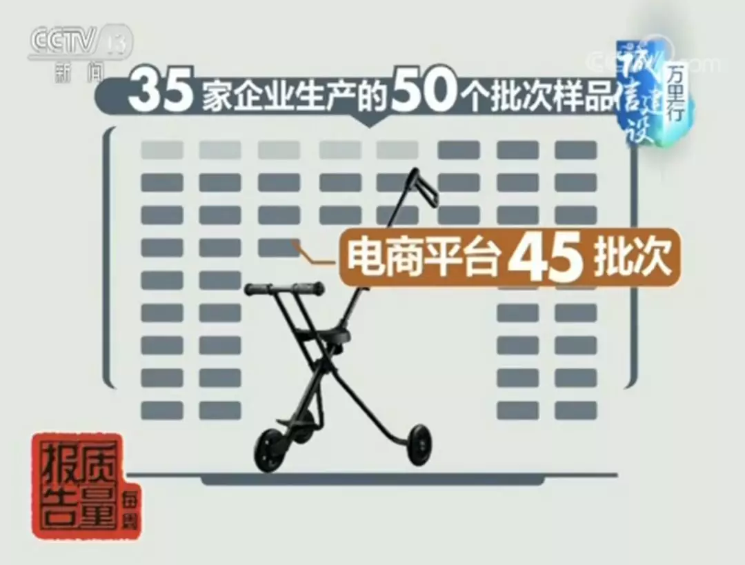 這次風險監(jiān)測共采集了35家企業(yè)生產(chǎn)的50個批次樣品,其中實體店5批次,電商平臺45批次。50批次樣品中一半為熱銷程度最高的“三輪遛娃神器”,采樣適用年齡重點覆蓋了3歲以下的兒童。