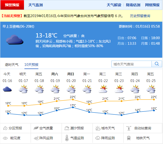 深圳新聞網(wǎng)2019年1月16日訊(記者 陳婕)記者從深圳市氣象局了解到,16日受冷空氣和切變線影響,陰天有分散小雨,天氣顯著轉(zhuǎn)涼,沿海和高地陣風(fēng)6-7級(jí);17-18日多云,可見陽(yáng)光,早晚較冷;19-20日受偏東氣流影響,陰天間多云,間中有分散小雨。21日陰天有小雨轉(zhuǎn)多云,氣溫下降;22日起天氣晴朗干燥。