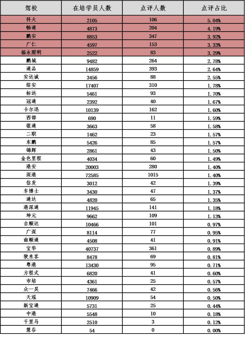 第四季度教練員點(diǎn)評占比最高的前5名駕校分別為:科大、暢通、鵬安、廣仁、福永照明。