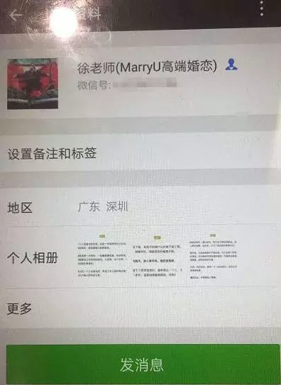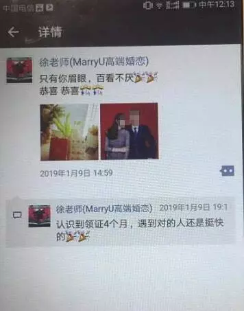 沒(méi)想到半個(gè)月之后,陳先生的朋友發(fā)現(xiàn),他的結(jié)婚照出現(xiàn)在了一個(gè)婚戀公司員工的朋友圈里。陳先生告訴記者,這個(gè)員工轉(zhuǎn)發(fā)他的照片同時(shí)還在上面評(píng)論寫上“認(rèn)識(shí)到領(lǐng)證四個(gè)月,遇到對(duì)的人還是挺快的”。