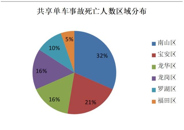 從事故行政區(qū)分布來(lái)看,南山區(qū)發(fā)生的共享單車(chē)事故死亡人數(shù)最多,死亡6人、占比約為32%,其次為寶安區(qū)、死亡4人、占比21%。