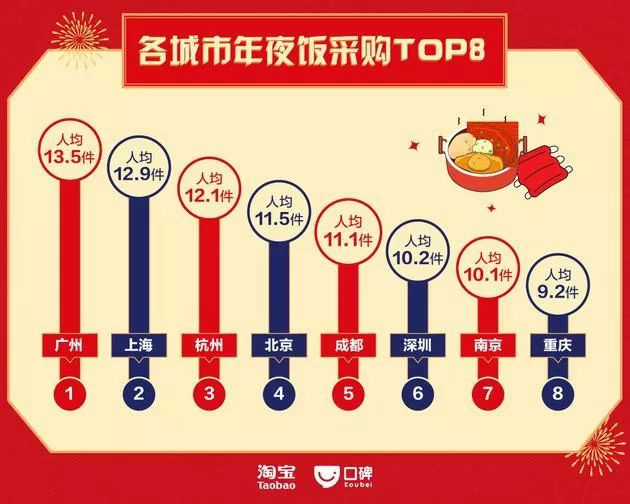 《大賞》顯示,臘月里,廣州人在淘寶人均下單13.5件年貨,雄居全國第一,深圳人以人均10.2件位居第六。