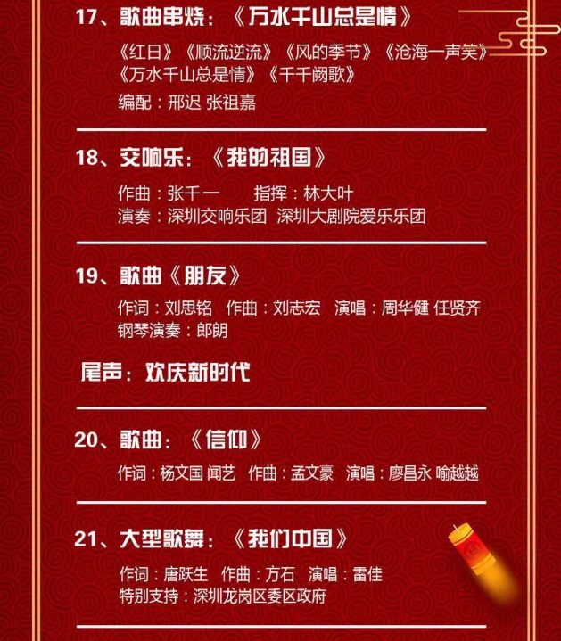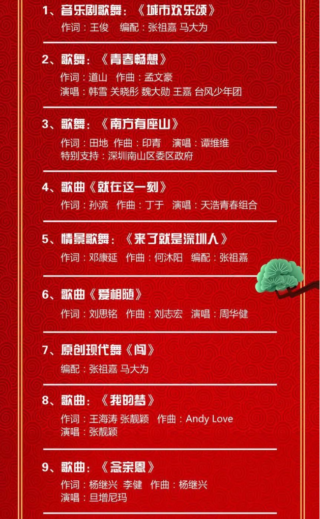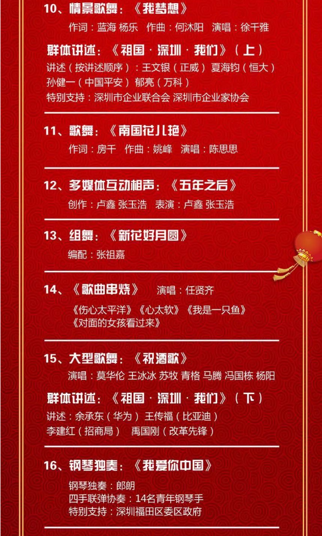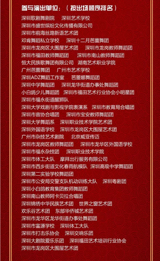 深圳春晚由央視主持人李思思、深圳衛(wèi)視主持人龐瑋、楚喬和香港著名主持人陳啟泰共同主持。晚會節(jié)目內容豐富、表現形式多樣,有歌舞、歌曲、交響樂,還有多媒體互動相聲。演員陣容強大,邀請了張靚穎、廖昌永、郎朗、周華健、汪明荃、任賢齊、譚維維等多位明星參演,力爭為全國觀眾送上一道豐盛又精彩的年夜“大餐”。
