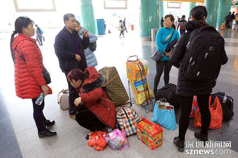 不少旅客攜帶當(dāng)?shù)厮约凹亦l(xiāng)特產(chǎn)返回深圳,圖中這一家人下車后整理行李