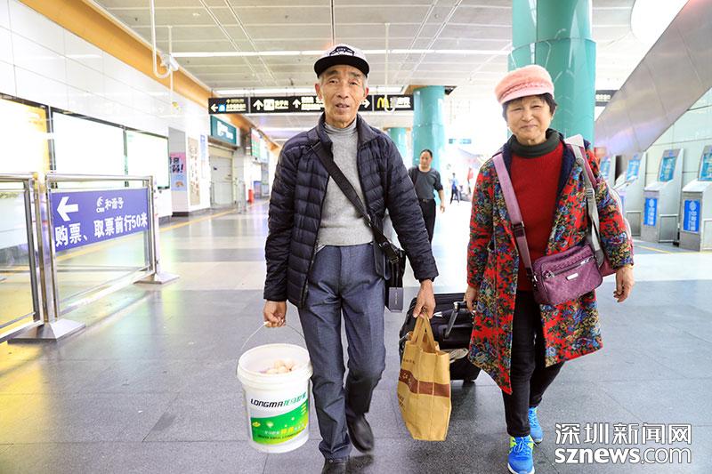 老家益陽的徐爺爺此次返深,從家里帶了雞蛋還有家鄉(xiāng)的花生,滿滿裝了一大桶