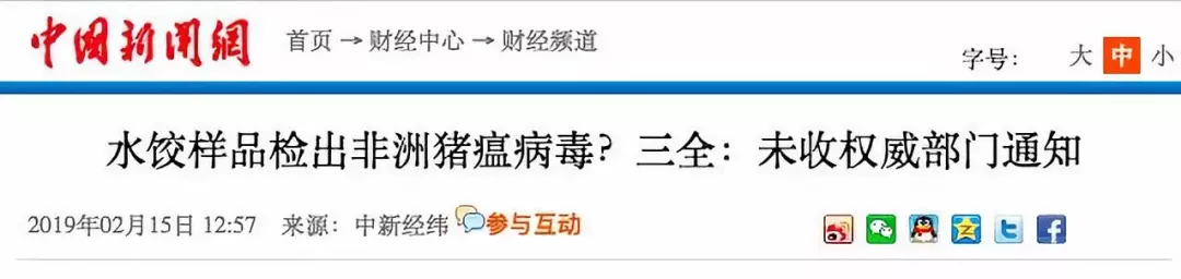 據(jù)紅星新聞報(bào)道,多家媒體稱,2月9日,湖南省湘西自治州重大動(dòng)物疫病防制指揮部辦公室接到省防治重大動(dòng)物疫病指揮部辦公室通知,要求瀘溪縣重大動(dòng)物疫病防制指揮部辦公室對(duì)來(lái)源于吉首市凌云冷凍食品批發(fā)部?jī)鰩?kù)的產(chǎn)品進(jìn)行抽樣,在瀘溪縣好又多和萬(wàn)家福兩家超市共抽取4個(gè)批次12份樣品,經(jīng)州動(dòng)物疫病預(yù)防控制中心檢測(cè),其中由河南三全食品有限公司生產(chǎn)批次為20190113H的“三全灌湯水餃”3份樣品為非洲豬瘟病毒核酸陽(yáng)性。