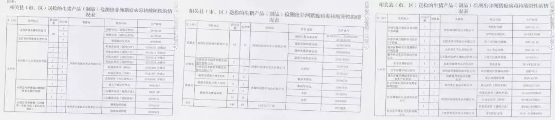 除速凍食品外,該網(wǎng)友發(fā)帖顯示,標(biāo)稱河南省長(zhǎng)隆食品有限責(zé)任公司、濟(jì)南康利斯食品有限公司、山東齊匯食品有限公司、山東臨沂金鑼文瑞食品有限公司、河南惠萬(wàn)家食品有限公司、合肥市凱樂(lè)斯食品有限公司生產(chǎn)的培根、香腸、火腿腸等個(gè)別批次產(chǎn)品樣品,也被檢出非洲豬瘟病毒核酸陽(yáng)性。