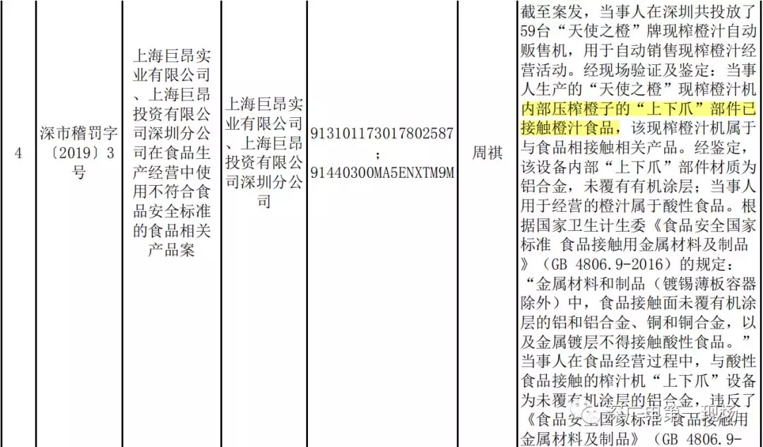 深廣電第一現(xiàn)場2019年2月19日訊 18日我們報道了,“天使之橙”現(xiàn)榨橙汁自動販?zhǔn)蹤C(jī),其生產(chǎn)的現(xiàn)榨橙汁機(jī),內(nèi)部壓榨橙子的鋁合金“上下爪”部件,已接觸橙汁食品。根據(jù)《食品接觸用金屬材料及制品》相關(guān)標(biāo)準(zhǔn),其涉嫌違反《食品安全法》,被深圳市市場稽查局開出巨額罰單,沒收其違法所得1199070元。