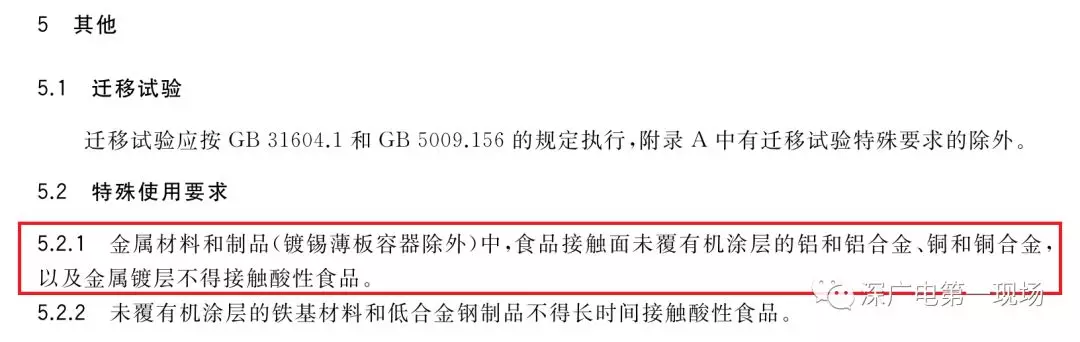 根據(jù)《食品安全國家標(biāo)準(zhǔn)食品接觸用金屬材料及制品》(GB4806.9-2016)規(guī)定,“金屬材料和制品(鍍錫薄板容器除外)中,食品接觸面未覆有機(jī)涂層的鋁和鋁合金、銅和銅合金,以及金屬鍍層不得接觸酸性食品?!?/p>