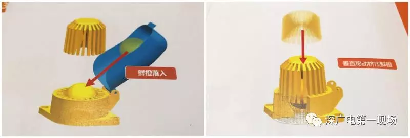 經(jīng)監(jiān)管人員調(diào)取相關(guān)技術(shù)圖紙,確認(rèn)這兩個碗狀的金屬部件就是“上下爪”,大部分材質(zhì)為鋁合金,是榨取橙汁的核心部件,通過垂直合攏上下爪,對兩爪之間的橙子施加壓力,擠出的橙汁經(jīng)由橙子下方的孔洞流入不銹鋼儲汁桶,再經(jīng)由導(dǎo)流管將橙汁注入紙杯內(nèi),售賣給消費(fèi)者。