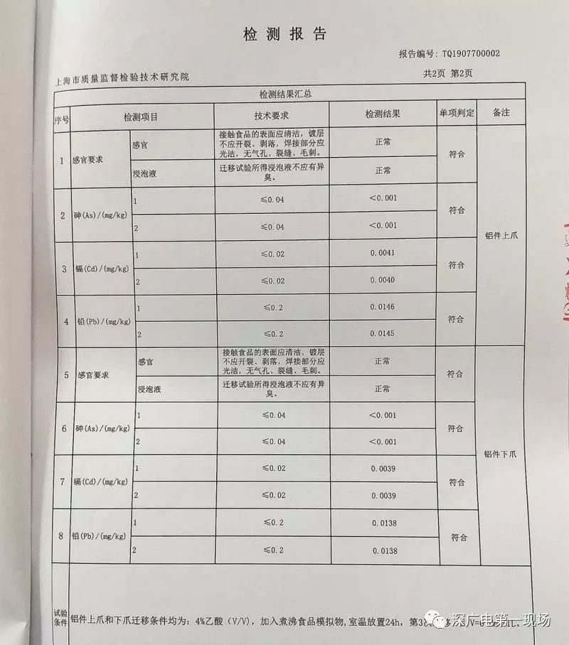 在現(xiàn)場,松江區(qū)市場監(jiān)管局還向記者出示了一份該局抽樣后委托上海市質(zhì)檢院進(jìn)行檢測的檢測報告,檢測對象是“天使之橙”現(xiàn)榨橙汁機(jī)的上下爪,檢測依據(jù)就是上述的我國國家標(biāo)準(zhǔn)《食品接觸用金屬材料及制品》。經(jīng)檢測,相關(guān)部件的檢測項(xiàng)目均符合上述標(biāo)準(zhǔn)。