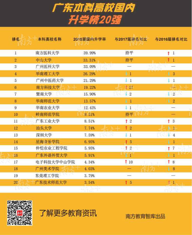 在發(fā)布“薪酬榜”后(點擊查看“薪酬榜”),今天南方教育智庫繼續(xù)獨家推出廣東高校“升學(xué)榜”,梳理全省123所高校發(fā)布的《2018年畢業(yè)生就業(yè)質(zhì)量年度報告》的關(guān)鍵數(shù)據(jù),聚焦畢業(yè)生的深造路徑和升學(xué)比例。其中南方醫(yī)科大學(xué)、中山大學(xué)、廣州醫(yī)科大學(xué)本科畢業(yè)生國內(nèi)升學(xué)率位列前3名,均超過33%。