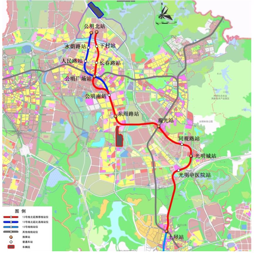 13號(hào)線北延線連接光明鳳凰城、公明中心等地區(qū),并通過(guò)已建成運(yùn)營(yíng)的13號(hào)線連接至南山后海,是聯(lián)系光明新區(qū)與南山中心的市域快線。