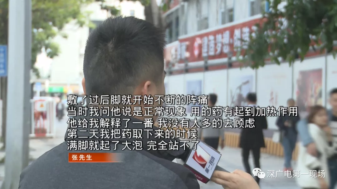 張先生曾跟簡某討說法,要他退500塊藥費(fèi),簡某說退錢是不可能的,而且張先生的水泡,他就能處理。但張先生已經(jīng)不敢相信簡某。